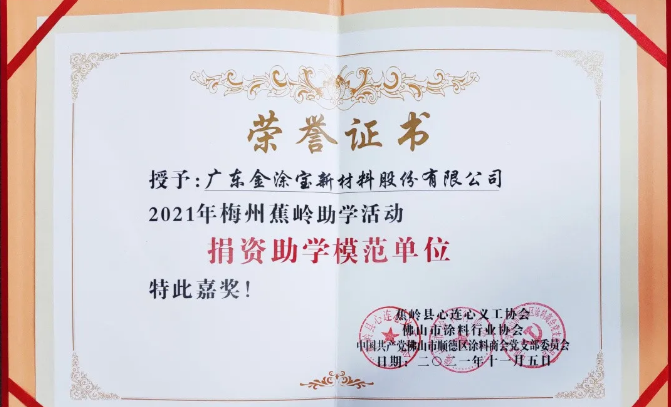 在此次梅州蕉嶺助學(xué)活動(dòng)中,廣東金涂寶新材料股份有限公司榮獲“捐資助學(xué)模范單位”的稱號(hào)。一直以來,金涂寶都積極參與教育事業(yè),在發(fā)展企業(yè)發(fā)展經(jīng)濟(jì)的同時(shí),不忘支持教育,關(guān)心青少年成長(zhǎng),伸出援助之手,為黨和政府分憂,為人民群眾解困;用實(shí)際行動(dòng)幫扶貧困學(xué)子。