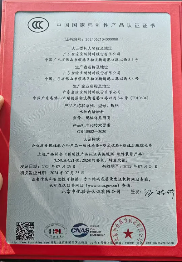 金涂寶--華喆榮獲國家3C認(rèn)證,不僅是對公司產(chǎn)品質(zhì)量和安全管理能力的肯定,更是對公司品牌實(shí)力和市場競爭力的提升。這將進(jìn)一步增強(qiáng)消費(fèi)者對華喆漆產(chǎn)品的信任度和滿意度,推動公司在涂料行業(yè)中的持續(xù)發(fā)展和壯大。