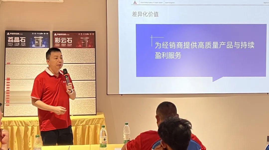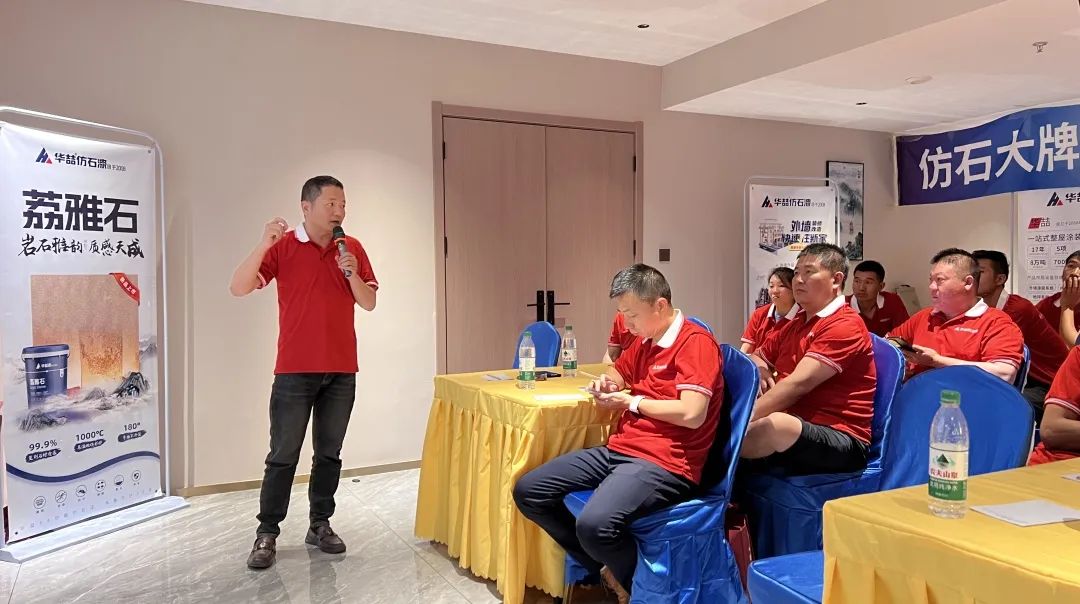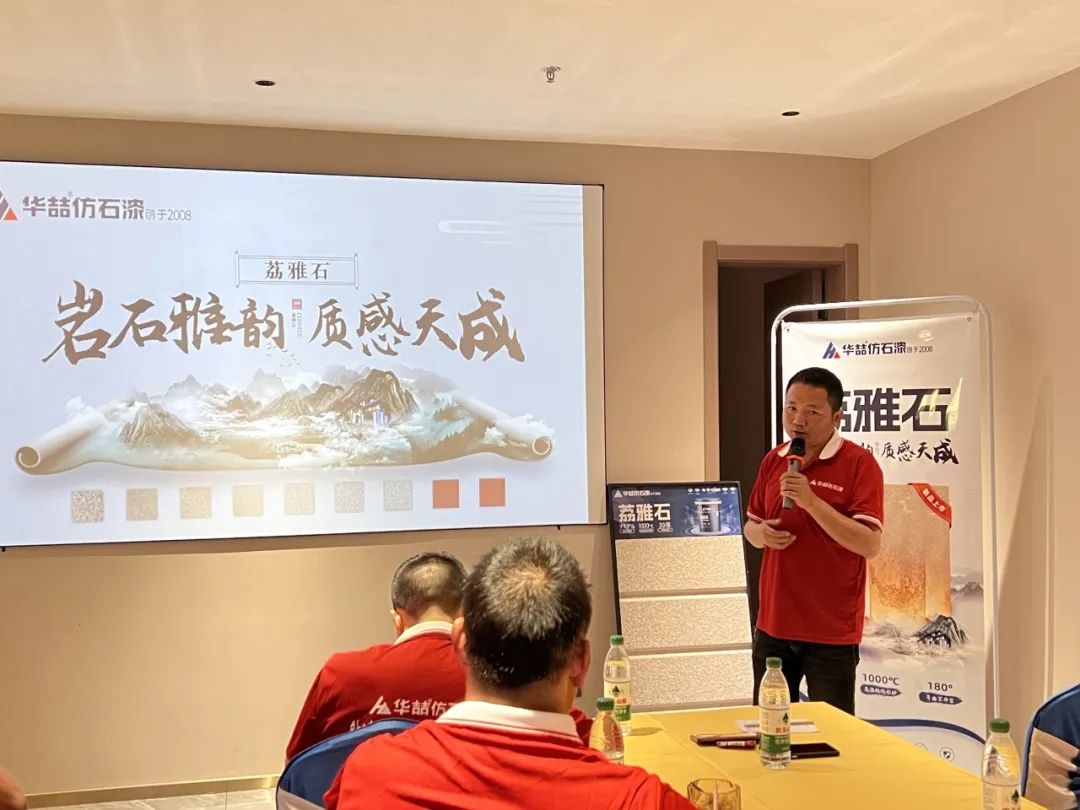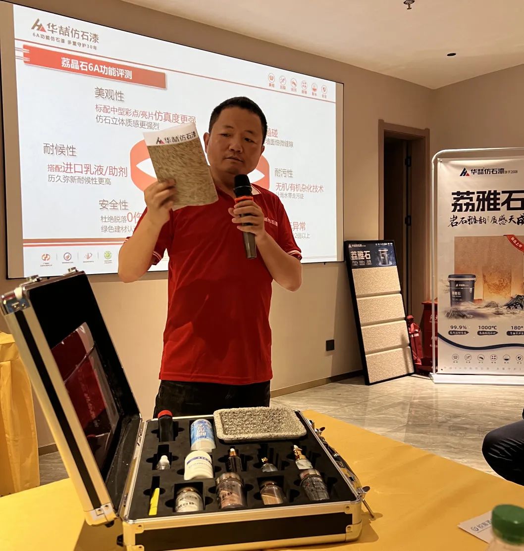 緊隨其后由云南區(qū)域負責人嚴總帶來華喆2025年度新品的分享,嚴總以生動的演講將公司最新推出的仿石涂料新品全方位地呈現(xiàn)給經(jīng)銷商們。從包裝理念到產(chǎn)品優(yōu)勢、市場潛力,讓在場的經(jīng)銷商們對新產(chǎn)品的市場前景充滿了信心。