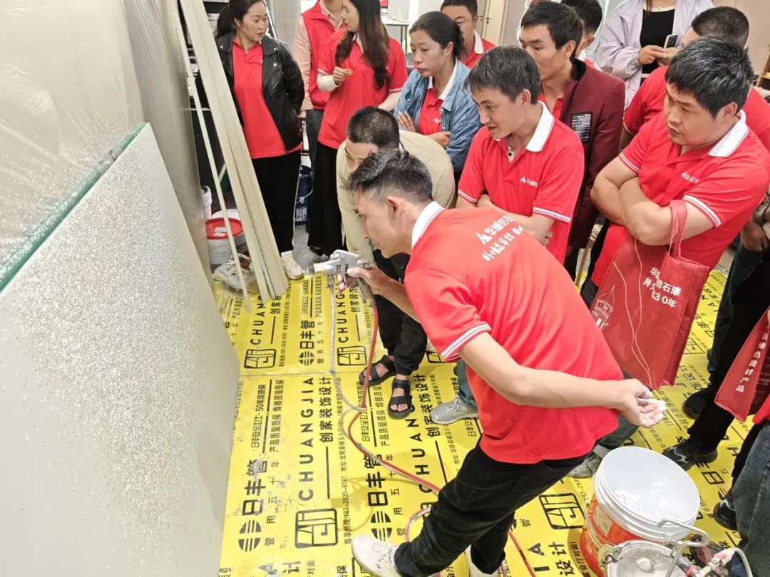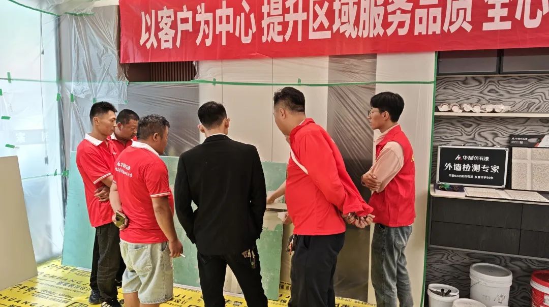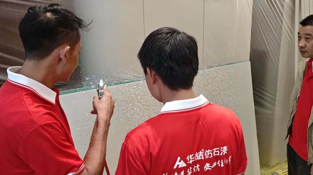 現(xiàn)場施工實操環(huán)節(jié),在華喆技術(shù)人員的指導(dǎo)下,油木工們親自上手,體驗了仿石漆的實際施工過程。他們認(rèn)真操作,仔細(xì)琢磨,不僅加深了對施工工藝的理解,還提升了自身的實操能力?,F(xiàn)場氛圍熱烈而有序,每個人都沉浸在仿石漆的魅力之中。