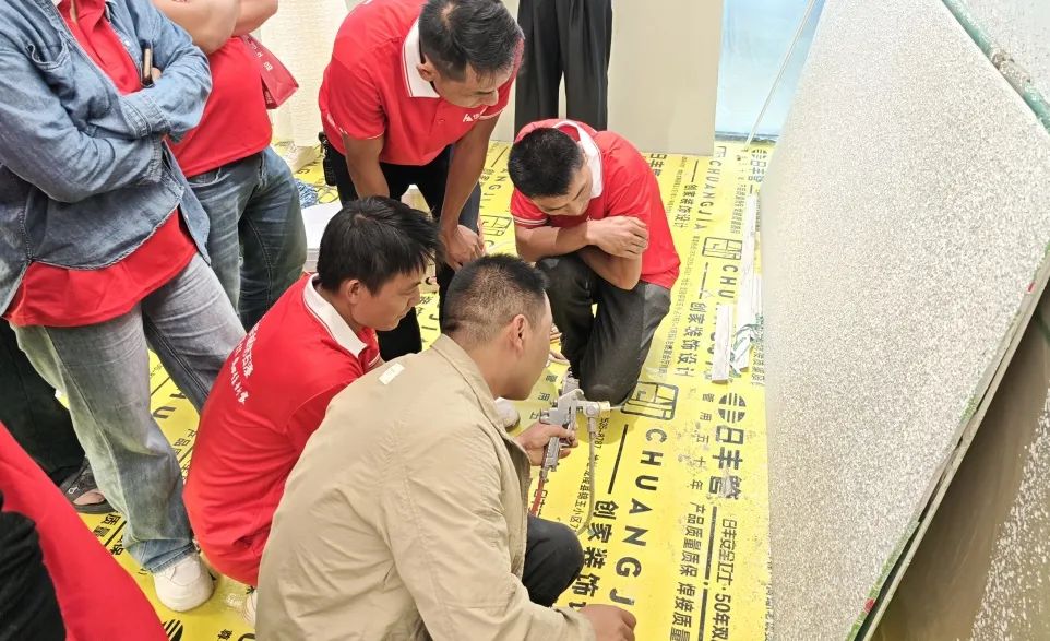 在本次培訓(xùn)活動的工藝賦能環(huán)節(jié)中,我們?yōu)楝F(xiàn)場師傅們帶來新的筑膜條施工工藝與技巧的分享盛宴。通過融入實際案例的生動講解,深入淺出地講解了仿石漆的施工要點、注意事項以及常見問題的解決方法。油木工師傅們表示,本次分享受益匪淺,對提升施工效率和質(zhì)量有著極大的幫助。