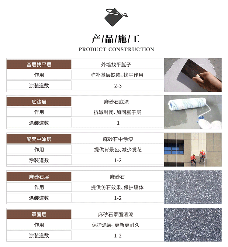 一次噴涂成型,效率高,噴涂兩遍效果更佳,凹凸感更強(qiáng),紋理更清晰;噴涂后不會(huì)像巖片漆那樣變形翹邊;施工寬容性高,可避免掉砂、發(fā)花、接茬等施工弊病。